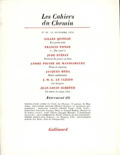 Gilles Quinsat, Les porte-voix Francis Ponge, " ... Du vent ! " Jude Stéfan, Portrait de jeune cycliste André Pieyre de Mandiargues, Peau et couteau Jacques Réda, Basse ambulante J. M. G. Le Clézio, Les bergers Jean-Louis Scheffer, La mort, le corps, rien Franck André Jamme, Le clodo du Dharma, vingt-cinq poèmes de Han-shan Jean-Pierre Richard, Michel Chaillou, Le sentiment géographique Marianne Alphant, Michel Leiris, Frêle bruit Jean-Loup Trassard, Des moulins à vent Jude Stéfan, Jacques Derrida, L'archéologie du frivole Jean Demélier, Le monde fabuleux de Jan Lebenstein Jérôme Prieur, Éric Rohmer, La marquise d'O Jean-Jacques Schuhl, La mode : Elsa de Schiaparelli