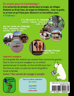 En avant pour le Cambodge !<br /> A la recherche de temples cachés dans la jungle, de villages flottants au fil de l’eau, de singes et d’éléphants... Le vrai guide de voyage des enfants qui veulent faire comme les grands ! Son livre en main, il pourra servir de guide à toute la famille et aura tout ce qu’il faut pour découvrir ce merveilleux pays.<br /> Contenu : Une section pour découvrir le pays : géographie, histoire, école, us et coutumes, arts, faune et flore... Une section de visite du pays par thème : villes, monuments, espaces naturels, bords de mer. Une section pratique : lexique (khmer), infos pratiques, conseils...<br /> Les petits plus : une mise en page attractive (colorée, textes courts, nombreuses photos et illustrations), une section pour décrire ses expériences de voyage, une pochette pour conserver ses souvenirs.