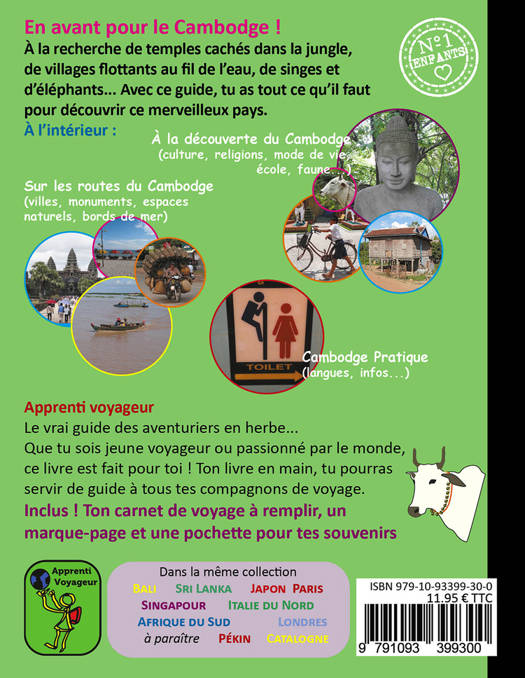 En avant pour le Cambodge ! Le vrai guide desaventuriers en herbe ! À la recherche de temples cachés dans lajungle, de villages flottants au fil de l’eau, de singes et d’éléphants...Destiné aux jeunes, voyageurs ou passionnés par le monde, ce livre contient toutce qu’il faut pour appréhender ce pays fascinant et servir de guide à tous sescompagnons de voyage. Contenu : Une section pour découvrir le pays :géographie, histoire, école, us et coutumes, arts, faune et flore... Une sectionde visite du pays par thème : villes, monuments, espaces naturels, bords de mer.Une section pratique : lexique (khmer), infos pratiques, conseils...Les petits plus : une mise en page attractive (colorée, textes courts,nombreuses photos et illustrations), une section pour décrire ses expériences devoyage, une pochette pour conserver ses souvenirs, un marque-page à découper.