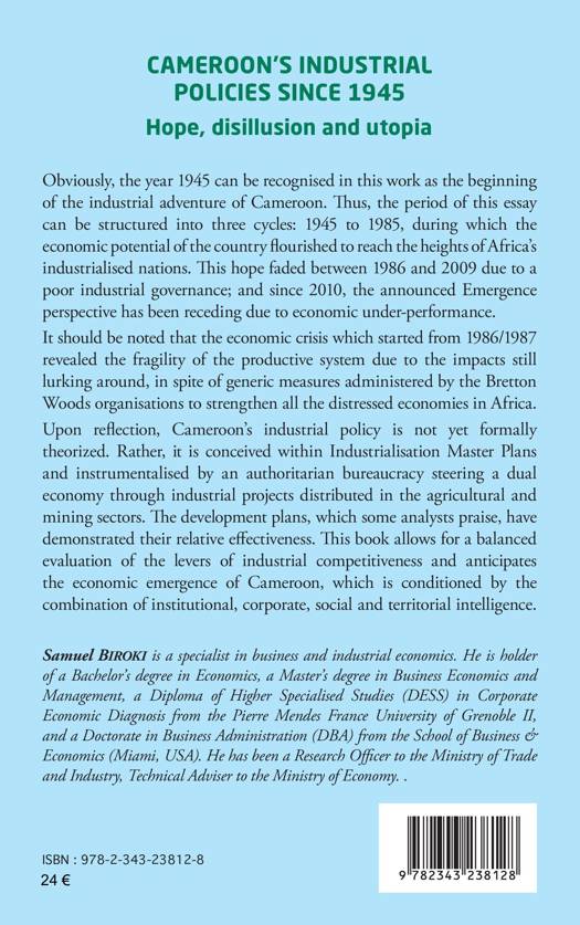 Obviously, the year 1945 can be recognised in this work as the beginning of the industrial adventure of Cameroon. Thus, the period of this essay can be structured into three cycles: 1945 to 1985, during which the economic potential of the country flourished to reach the heights of Africa’s industrialised nations. This hope faded between 1986 and 2009 due to a poor industrial governance; and since 2010, the announced Emergence perspective has been receding due to economic under-performance. This book allows for a balanced evaluation of the levers of industrial competitiveness and anticipates the economic emergence of Cameroon, which is conditioned by the combination of institutional, corporate, social and territorial intelligence.