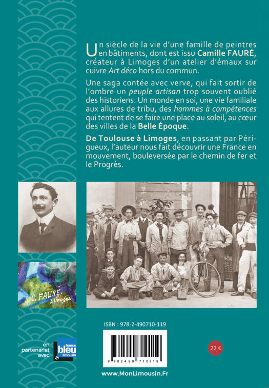 Un siècle de la vie d’une famille de peintres en bâtiments, dont est issu Camille Fauré, créateur à Limoges d’un atelier d’émaux sur cuivre Art déco hors du commun. Une saga contée avec verve, qui fait sortir de l’ombre un peuple artisan trop souvent oublié des historiens. Un monde en soi, une vie familiale aux allures de tribu, des hommes à compétences qui tentent de se faire une place au soleil, au cœur des villes de la Belle Époque. De Toulouse à Limoges, en passant par Périgueux, l’auteur nous fait découvrir une France en mouvement, bouleversée par le chemin de fer et le Progrès. L’ouvrage, qui se lit comme un roman, présente aussi des documents rares et jamais publiés sur la vie et l’œuvre de Camille Fauré.
