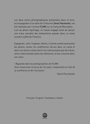 "Les deux séries photographiques présentées dans ce livre, accompagnées d'un texte de l'historien Denis Peschanski, ont été réalisées sur une période de deux ans par l'artiste FLORE sur le Camp de Rivesaltes. Loin du photo-reportage, ce travail engagé tente de laisser une trace sensible des événements passés dans ce camp souvent oublié de l'histoire. FLORE utilise ici l'art comme instrument de mémoire, ce qui est sa manière de se positionner face au «faisceau de ténèbres qui provient de son temps», comme dit Giorgio Agamben. Elle a écrit à propos de ce travail : «J'ai embrassé toutes les peines, toutes les souffrances vécues dans ce camp et dans ces autres camps dont il ne reste presque pas de traces, sinon celles laissées dans les mémoires, et je les ai réunies dans mon coeur. Ce livre est né de la nécessité de cet accordage, d'un glissement de l'émotion violente, quasiment physique, vers la maturité d'une peine pleinement assumée et exprimée grâce à l'art, si j'ose dire"". FLORE "