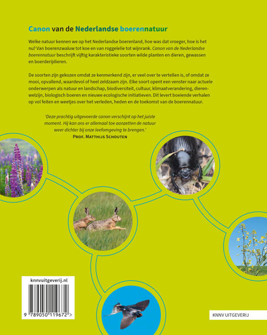 Welke natuur kennen we op het Nederlandse boerenland, hoe was dat vroeger, hoe is het nu? Van boerenzwaluw tot koe en van roggelelie tot wijnrank. ‘Canon van de Nederlandse boerennatuur’ beschrijft vijftig karakteristieke soorten wilde planten en dieren, gewassen en boerderijdieren.