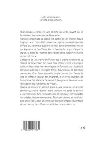 Shani Diluka a conçu ce livre comme un jardin ouvert où se feuillettent les méandres de l'humanité. Pianiste concertiste, la poésie fait partie de ses escales et cultive son chemin depuis toujours. Comme un coeur déstructuré qui regarde une réalité parfois difficile ou, comme le suggère Novalis, tente de toucher le vrai par le prisme de l'ineffable, à la recherche de ce qui lui importe le plus, la place de l'homme dans l'ordre de la Nature et le sens de notre être.