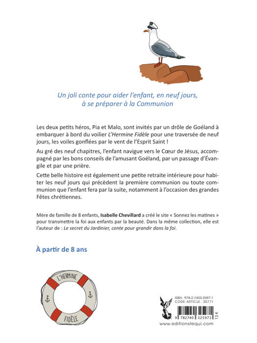 Les deux petits héros, Pia et Malo, sont invités par un drôle de Goéland à embarquer à bord d’un voilier pour une traversée de neuf jours, les voiles gonflées par le vent de l’Esprit Saint ! Les situations rencontrées sont l’occasion d’approfondir des thèmes spirituels, plus particulièrement autour de l’Eucharistie. La neuvaine comporte neuf chapitres, comme Le secret du Jardinier, avec pour chaque jour un récit, un passage d’Évangile et une prière. À la fois une belle histoire à lire et un bon outil conçu comme une petite retraite intérieure pour habiter les neuf jours qui précèdent la première communion ou toute communion par la suite, notamment à l’occasion des grandes Fêtes chrétiennes.