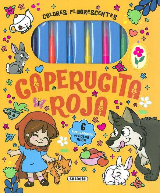 Utiliza las pinturas fluorescentes que encontrarás en este libro y llena de color las mágicas ilustraciones del cuento de Caperucita Roja.