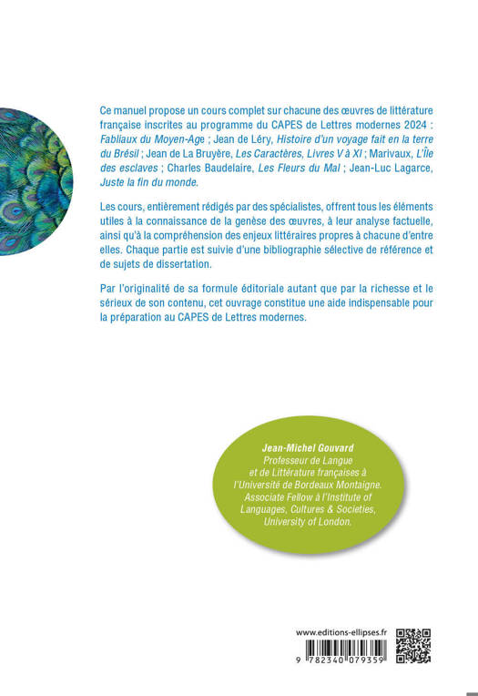 Ce manuel propose un cours complet sur chacune des œuvres de littérature française inscrites au programme du CAPES de Lettres modernes 2024 : Fabliaux du Moyen-Age ; Jean de Léry, Histoire d’un voyage fait en la terre du Brésil ; Jean de La Bruyère, Les Caractères, Livres V à XI ; Marivaux, L’Ile des esclaves ; Charles Baudelaire, Les Fleurs du Mal ; Jean-Luc Lagarce, Juste la fin du monde.