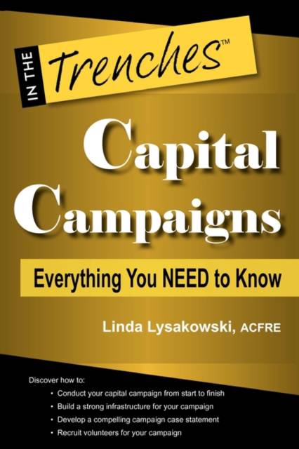 Do you work for or serve on the board of a nonprofit that is thinking about or ready to launch a capital campaign? Capital Campaigns: Everything You NEED to Know will equip you to determine your organization's readiness for a campaign; help you decide if and when you need a planning study; show you how to allocate your human and financial resources effectively; guide you in creating a compelling case statement; provide you with the tools to evaluate your chances for success; give you how-to advice to plan every aspect of your campaign; and put at your fingertips ample examples of sample forms and charts. This is one of a series of "In the Trenches" books published by CharityChannel Press. You'll know an In the Trenches book not just by its cover, but by the author's fun, upbeat writing style. But don't be fooled by their down-to-earth approach and ample use of sidebars. In the Trenches books are authoritative and cover what a beginner should know to get started and progress rapidly, and what a more experienced nonprofit-sector practitioner needs to move forward in the subject.