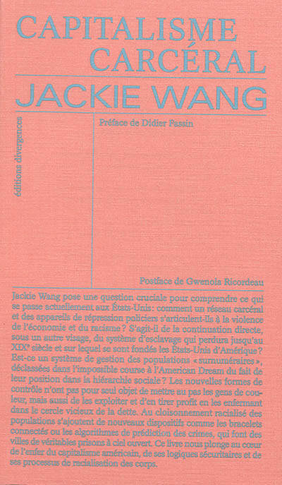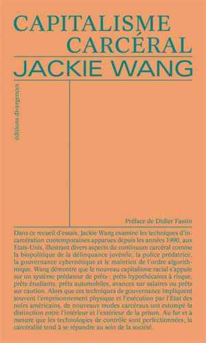 Jackie Wang examine les techniques d'incarcération contemporaines apparues dans les années 1990 aux Etats-Unis, illustrant divers aspects du continuum carcéral comme la biopolitique de la délinquance juvénile, la police prédatrice, la gouvernance cybernétique et le maintien de l'ordre algorithmique. Pour Wang le capitalisme carcéral fait autant usage d'une violence directe - police et incarcération - qu'indirecte en s'appuyant notamment sur un système prédateur de prêts. Alors que ces techniques de gouvernance impliquent souvent l'emprisonnement physique et l'exécution par l'Etat des personnes racisées, ces nouveaux modes carcéraux se répandent dehors, au sein de la société.