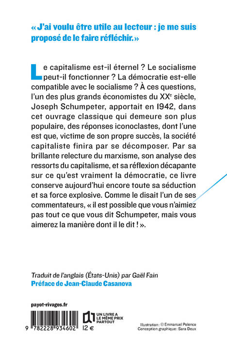 Le capitalisme est-il éternel ? Le socialisme peut-il fonctionner ? La démocratie est-elle compatible avec le socialisme ? À ces questions, l'un des plus grands économistes du XXe siècle, Joseph Schumpeter, apportait en 1942, dans cet ouvrage classique qui demeure son plus populaire, des réponses iconoclastes, dont l'une est que, victime de son propre succès, la société capitaliste finira par se décomposer. Par sa brillante relecture du marxisme, son analyse des ressorts du capitalisme, et sa réflexion décapante sur ce qu'est vraiment la démocratie, ce livre conserve aujourd'hui encore toute sa séduction et sa force explosive. Comme le disait l'un de ses commentateurs, « il est possible que vous n'aimiez pas tout ce que vous dit Schumpeter, mais vous aimerez la manière dont il le dit ! »