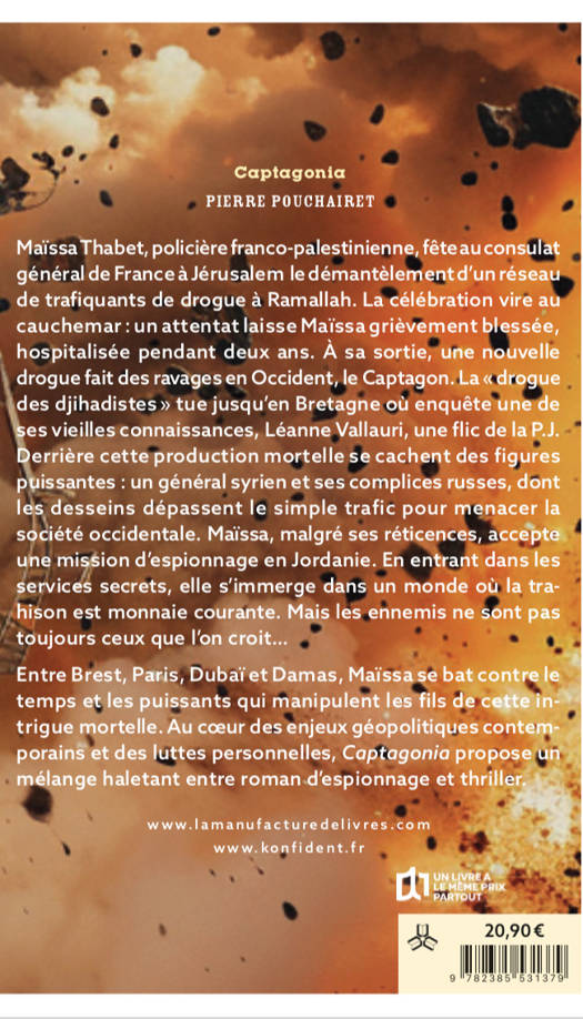 Entre Brest, Paris, Dubaï et Damas, Maïssa se bat contre le temps et les puissants qui manipulent les fils de cette intrigue mortelle. Au cœur des enjeux géopolitiques contemporains et des luttes personnelles, Captagonia propose un mélange haletant entre roman d’espionnage et thriller.