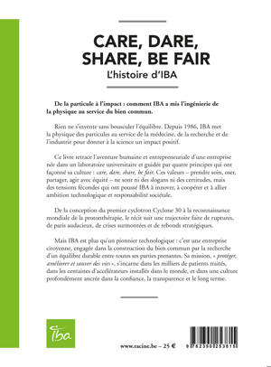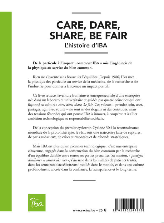 Ce livre retrace l'aventure humaine et entrepreneuriale d'une entreprise née dans un laboratoire universitaire et guidée par quatre principes qui ont façonné sa culture : care, dare, share, be fair. Ces valeurs – prendre soin, oser, partager, agir avec équité – ne sont ni des slogans ni des certitudes, mais des tensions fécondes qui ont poussé IBA à innover, à coopérer et à allier ambition technologique et responsabilité sociétale.