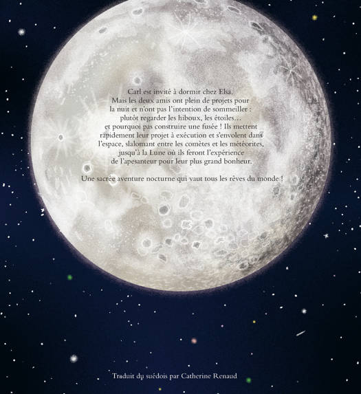 Après le succès de «Carl et Elsa s'échappent» et «Carl et Elsa prennent le large», de nouvelles aventures des deux amis au cours d'une nuit où Carl est invité à dormir chez Elsa. La nuit sera bien entendu agitée puisqu'ils ont cette fois l'intention d'explorer l'espace. Ce qu'ils sont en embarquant à bord de Valentina (leur fusée), slalomant entre les étoiles, les météorites et les hiboux de nuit, jusqu'à la Lune où expérience de l'apesanteur et moonwalk feront leur bonheur. Ces nouvelles aventures mettent une fois de plus merveilleusement en images l'imaginaire surpuissant des enfants, avides de découverte de territoires lointains représentés à l'aide de fourmillants détails. Cet album rappelle aussi le goût pour les enfants de dormir l'un chez l'autre, un moment privilégié toujours prop