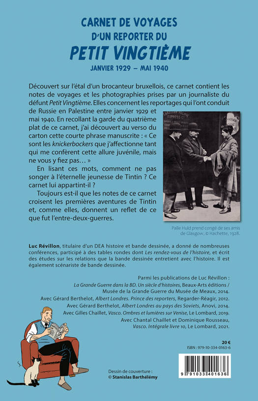 Découvert sur l'étal d'un brocanteur bruxellois, ce carnet contient les notes de voyages et les photographies prises par un journaliste du défunt Petit Vingtième. Elles concernent les reportages qui l'ont conduit de Russie en Palestine entre janvier 1929 et mai 1940. En recollant la garde du quatrième plat de ce carnet, j'ai découvert au verso du carton cette courte phrase manuscrite : « Ce sont les knickerbockers que j'affectionne tant qui me confèrent cette allure juvénile, mais ne vous y fiez pas... »