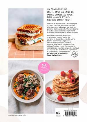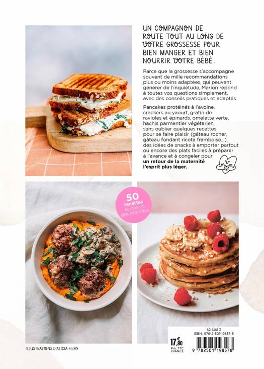 Parce que la grossesse s’accompagne souvent de mille recommandations plus ou moins adaptées, qui peuvent générer de l’inquiétude, Marion répond à toutes vos questions simplement, avec des conseils pratiques et adaptés. Pancakes protéinés à l’avoine, crackers au yaourt, gratin de ravioles et épinards, omelette verte, hachis parmentier végétarien, sans oublier quelques recettes pour se faire plaisir (gâteau rocher, gâteau fondant ricota framboise…), des idées de snacks à emporter partout ou encore des plats faciles à préparer à l’avance et à congeler pour un retour de la maternité l’esprit plus léger.