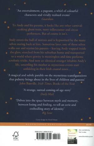 It had its own little backstreets, its alleyways of hanging bulbs and ghost trains and Punch and Judy stands . And at the end of one he saw the Hall of Mirrors. There were looping strings of carnival lights leading towards it, and a large sign in mirrored glass reading 'Burleigh's Amazing Hall of Mirrors' and the sign reflected the lights in all sorts of magically distorted ways. To Andy and his parents, it looks like any other carnival: creaking ghost train, rusty rollercoaster and circus performers. But of course it isn't. Drawn to the hall of mirrors, Andy enters and is hypnotised by the many selves staring back at him. Sometime later, one of those selves walks out rejoins his parents - leaving Andy trapped inside the glass, snatched from the tensions of his suburban home and transported to a world where the laws of gravity are meaningless and time performs acrobatic tricks. And now an identical stranger inhabits Andy's life, unsettling his mother with a curious blankness, as mysterious events start unfolding in their Irish coastal town.