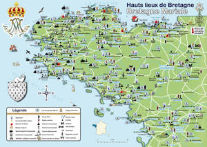 Cent cinquante lieux recensent Apparitions, chapelles, statues vénérées, fontaines miraculeuses et autres lieux dédiés à la Vierge et à sainte Anne. Indication des lieux d'intérêt majeurs : Monuments, Villes fortifiées, Calvaires et Enclos, Mégalithes, Panoramas, Pardons, Tro Breiz, Reliques exceptionnelles... Au dos, calendrier des Pardons et liste alphabétique des lieux d'intérêt majeur avec historique et intérêt culturel par lieu. Tout ce que la Bretagne recèle de trésors à portée de main ! Taille A2.
