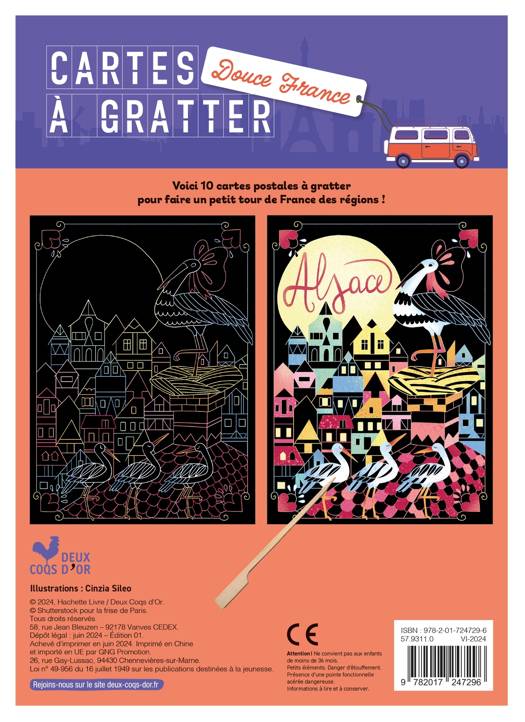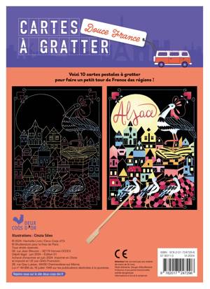 Un carnet de 10 cartes à gratter, en format « carte postale », sur le thème du voyage aux couleurs de la France. 10 petits tableaux représentant différents paysages (mer, montagne, ville, campagne). Pour chacun d’eux, l’enfant va pouvoir colorier et créer des motifs grâce à la technique de la carte à gratter. Le verso de chaque carte est imprimé pour pouvoir envoyer sa carte si on le souhaite !