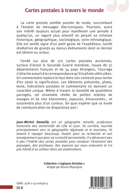 La carte postale semble passée de mode, succombant à l’emploi de messages électroniques. Pourtant, outre son intérêt toujours actuel pour manifester une pensée à quelqu’un, un regard plus attentif en perçoit sa richesse historique, géographique, sociologique, voire ethnologique. Elle est tantôt signe d’un petit geste de l’expéditeur, tantôt révélatrice de grands ou menus évènements dont ce dernier est témoin ou acteur. Fondé sur plus de 170 cartes postales anciennes, surtout d’avant la Seconde Guerre mondiale, issues de 37 départements français et de 34 pays étrangers, l’ouvrage s’attache autant à la correspondance qu’à la photo véhiculées. Un commentaire replace le tout dans son contexte pour tenter d’en saisir la signification.