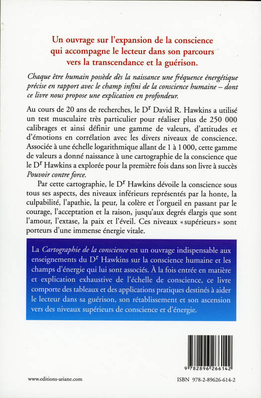 Au cours de 20 ans de recherches, le docteur David R. Hawkins a utilisé un test musculaire très particulier pour réaliser plus de 250?000 calibrages et ainsi définir une gamme de valeurs, d’attitudes et d’émotions en corrélation avec les divers niveaux de conscience. Associée à une échelle logarithmique, cette gamme de valeurs a donné naissance à une cartographie de la conscience que le docteur Hawkins a explorée. Par cette cartographie, le docteur Hawkins dévoile la conscience sous tous ses aspects, des niveaux inférieurs représentés par la honte, la culpabilité, l’apathie, la peur, la colère et l’orgueil en passant par le courage, l’acceptation et la raison, jusqu’aux degrés élargis que sont l’amour, l’extase, la paix et l’éveil. Ces niveaux « supérieurs » sont porteurs d’une immense énergie vitale. Cartographie de la conscience est un ouvrage indispensable aux enseignements du docteur Hawkins sur la conscience humaine et les champs d’énergie qui lui sont associés. À la fois entrée en matière et explication exhaustive de l’échelle de conscience, ce livre comporte des tableaux et des applications pratiques.