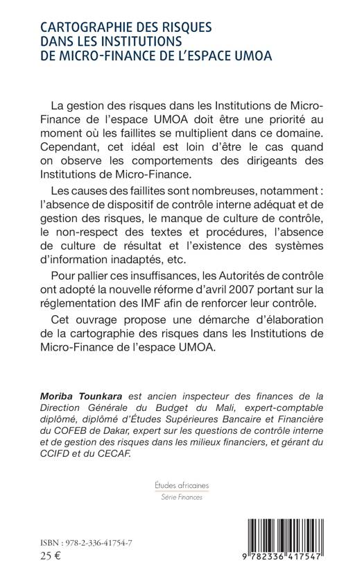 La gestion des risques dans les Institutions de Micro-Finance de l'espace UMOA doit être une priorité au moment où les faillites se multiplient dans ce domaine. Cependant, cet idéal est loin d'être le cas quand on observe les comportements des dirigeants des Institutions de Micro-Finance. Les causes des faillites sont nombreuses, notamment: l'absence de dispositif de contrôle interne adéquat et de gestion des risques, le manque de culture de contrôle, le non-respect des textes et procédures, l'absence de culture de résultat et l'existence des systèmes d'information inadaptés, etc. Pour pallier ces insuffisances, les Autorités de contrôle ont adopté la nouvelle réforme d'avril 2007 portant sur la réglementation des IMF afin de renforcer leur contrôle. Cet ouvrage propose une démarche d'élaboration de la cartographie des risques dans les Institutions de Micro-Finance de l'espace UMOA.