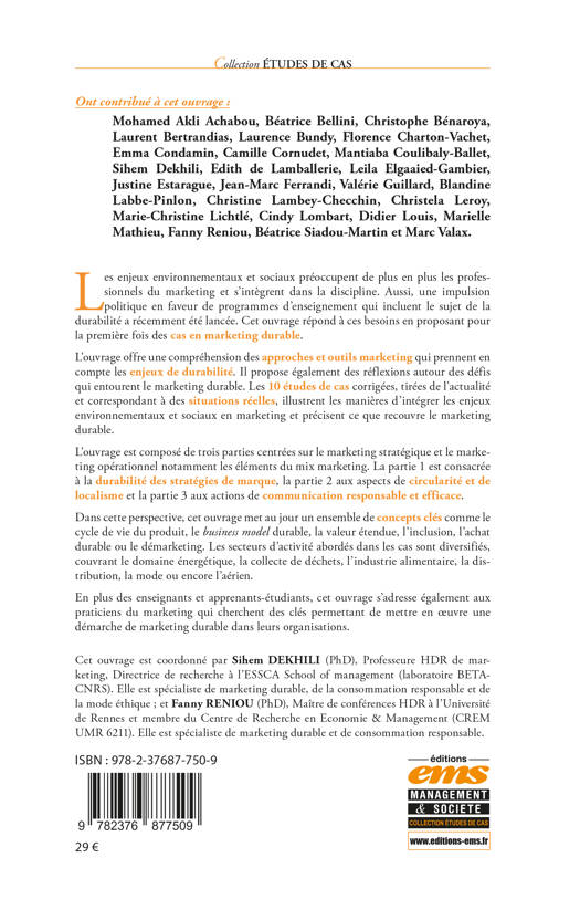 Les enjeux environnementaux et sociaux préoccupent de plus en plus les professionnels du marketing et s’intègrent dans la discipline. Aussi, une impulsion politique en faveur de programmes d’enseignement qui incluent le sujet de la durabilité a récemment été lancée. Cet ouvrage répond à ces besoins en proposant pour la première fois des cas en marketing durable.