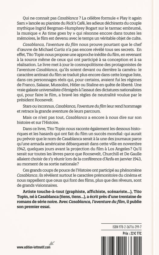 Dans ce livre, Tito Topin nous raconte également les dessous historiques et les hasards qui ont fait du film un succès mondial : qui aurait pu prévoir que le nom de Casablanca serait à la une des journaux parce qu’une armada américaine débarquerait dans cette ville en novembre 1942, quelques jours avant la projection du film à Los Angeles ? Qu’il serait sur toutes les lèvres parce que Roosevelt, Churchill et De Gaulle allaient choisir de s’y réunir lors de la conférence d’Anfa en janvier 1943, au moment de sa sortie nationale ?