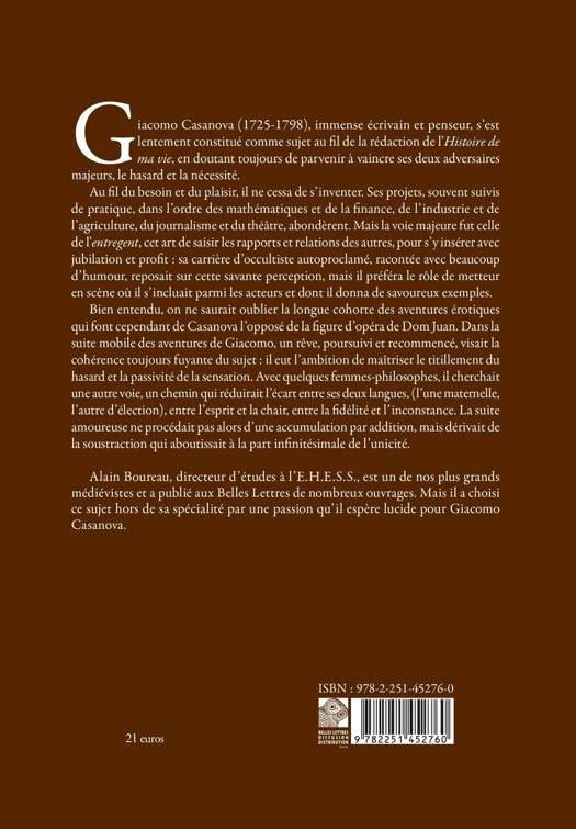 Giacomo Casanova (1725-1798), immense ecrivain et penseur, s'est lentement constitue comme sujet au fil de la redaction de l'Histoire de ma vie, en doutant toujours de parvenir a vaincre ses deux adversaires majeurs, le hasard et la necessite. Au fil du besoin et du plaisir, il ne cessa de s'inventer. Ses projets, souvent suivis de pratique, dans l'ordre des mathematiques et de la finance, de l'industrie et de l'agriculture, du journalisme et du theatre, abonderent. Mais la voie majeure fut celle de l'entregent, cet art de saisir les rapports et relations des autres, pour s'y inserer avec jubilation et profit: sa carriere d'occultiste autoproclame, racontee avec beaucoup d'humour, reposait sur cette savante perception, mais il prefera le role de metteur en scene ou il s'incluait parmi les acteurs et dont il donna de savoureux exemples. Bien entendu, on ne saurait oublier la longue cohorte des aventures erotiques qui font cependant de Casanova l'oppose de la figure d'opera de Dom Juan. Dans la suite mobile des aventures de Giacomo, un reve, poursuivi et recommence, visait la coherence toujours fuyante du sujet: il eut l'ambition de maitriser le titillement du hasard et la passivite de la sensation. Avec quelques femmes-philosophes, il cherchait une autre voie, un chemin qui reduirait l'ecart entre ses deux langues, (l'une maternelle, l'autre d'election), entre l'esprit et la chair, entre la fidelite et l'inconstance. La suite amoureuse ne procedait pas alors d'une accumulation par addition, mais derivait de la soustraction qui aboutissait a la part infinitesimale de l'unicite.