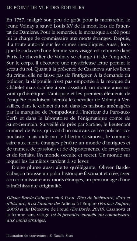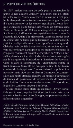 1759. Une femme sans visage est retrouvée dans Paris. Volnay, le "commissaire aux morts étranges", se charge de l'enquête. Surveillé de près par Sartine, qui voit d'un mauvais oeil ce policier hors normes, Volnay, secondé par un moine étrange et Casanova lui-même, remonte la piste d'un crime qui pourrait impliquer la Pompadour et jusqu'à Louis xv en personne. L'épisode inaugural d'une série policière historique extrêmement prometteuse.