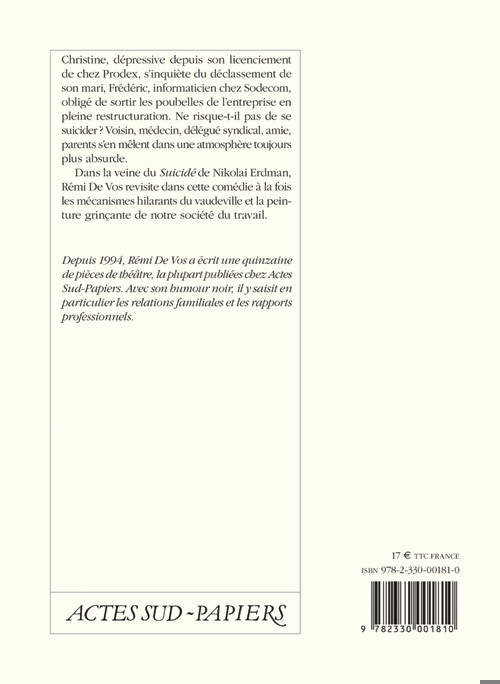 «Depuis 1994, Rémi De Vos a écrit une quinzaine de pièces de théâtre, la plupart publiées chez Actes Sud-Papiers. Avec son humour noir, il y saisit en particulier les relations familiales et les rapports professionnels.»
