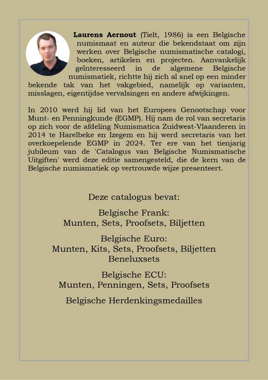 Laurens Aernout (Tielt, 1986) is een Belgische numismaat en auteur die bekendstaat om zijn werken over Belgische numismatische catalogi, boeken, artikelen en projecten. Aanvankelijk geïnteresseerd in de algemene Belgische numismatiek, richtte hij zich al snel op een minder bekende tak van het vakgebied, namelijk op varianten, misslagen, eigentijdse vervalsingen en andere afwijkingen. In 2010 werd hij lid van het Europees Genootschap voor Munt- en Penningkunde (EGMP). Hij nam de rol van secretaris op zich voor de afdeling Numismatica Zuidwest-Vlaanderen in 2014 te Harelbeke en Izegem en hij werd secretaris van het overkoepelende EGMP in 2024. Ter ere van het tienjarig jubileum van de 'Catalogus van Belgische Numismatische Uitgiften' werd deze editie samengesteld, die de kern van de Belgische numismatiek op vertrouwde wijze presenteert.