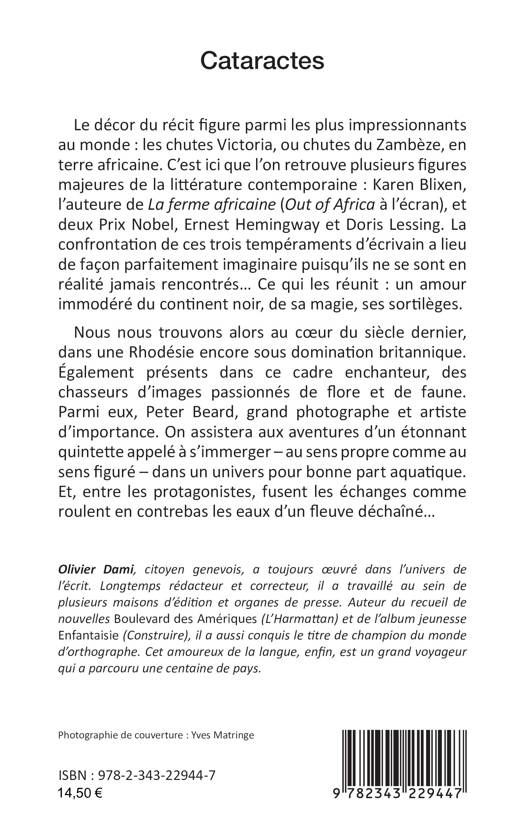 Le décor du récit figure parmi les plus impressionnants au monde : les chutes Victoria, ou chutes du Zambèze, en terre africaine. C’est ici que l’on retrouve plusieurs figures majeures de la littérature contemporaine : Karen Blixen, l’auteure de La ferme africaine (Out of Africa à l’écran), et deux Prix Nobel, Ernest Hemingway et Doris Lessing. La confrontation de ces trois tempéraments d’écrivain a lieu de façon parfaitement imaginaire puisqu’ils ne se sont en réalité jamais rencontrés... Ce qui les réunit : un amour immodéré du continent noir, de sa magie, ses sortilèges. Nous nous trouvons alors au coeur du siècle dernier, dans une Rhodésie encore sous domination britannique. Également présents dans ce cadre enchanteur, des chasseurs d’images passionnés de flore et de faune. Parmi eux, Peter Beard, grand photographe et artiste d’importance. On assistera aux aventures d’un étonnant quintette appelé à s’immerger - au sens propre comme au sens figuré - dans un univers pour bonne part aquatique. Et, entre les protagonistes, fusent les échanges comme roulent en contrebas les eaux d’un fleuve déchaîné...