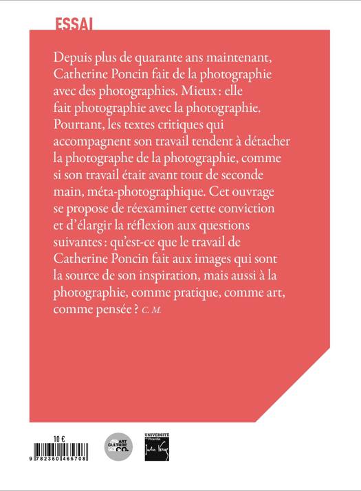 Depuis plus de quarante ans maintenant, Catherine Poncin fait de la photographie avec des photographies. Mieuxâ: elle fait photographie avec la photographie. Pourtant, les textes critiques qui accompagnent son travail tendent à détacher la photographe de la photographie, comme si son travail était avant tout de seconde main, méta-photographique. Cet ouvrage se propose de réexaminer cette conviction et d’élargir la réflexion aux questions suivantesâ: qu’est-ce que le travail de Catherine Poncin fait aux images qui sont la source de son inspiration, mais aussi à la photographie, comme pratique, comme art, comme penséeâ? C. M.<br /><br /><br /> Le Champ des Impossibles est une plateforme artistique et un outil culturel ambitieux de développement du territoire. Au service du public, il a pour mission de soutenir les artistes dans leurs créations, de conserver leurs oeuvres et de les diffuser auprès du plus grand nombre. Il s’agit de favoriser dans le Perche, en milieu rural, la diffusion de l’art contemporain et la médiation culturelle nourries par un dialogue vivant avec les artistes. Ce projet de territoire utilise l’art contemporain comme terrain partagé afin de créer du vivre ensemble en assurant la circulation des idées et des artistes.<br /> Les résidences de la Slow factory sont un axe majeur de cette stratégie. Les invitations guidées par le regard de Christine Ollier sont des temps de création passionnants, de rencontres et de croisements d’horizons.