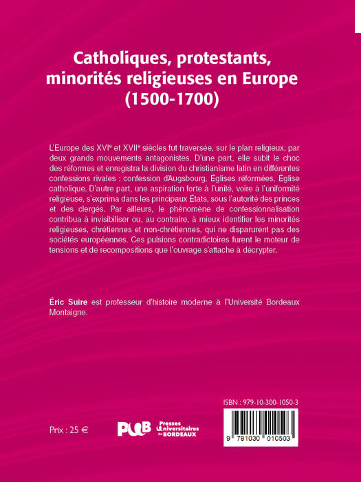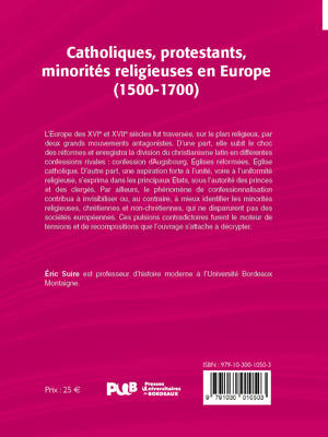 L'Europe des XVIe et XVIIe siècles fut traversée, sur le plan religieux, par deux grands mouvements antagonistes. D'une part, elle subit le choc des réformes et enregistra la division du christianisme latin en différentes confessions rivales : confession dAugsbourg, Églises réformées, Église catholique. D'autre part, une aspiration forte à l'unité, voire à l'uniformité religieuse, s'exprima dans les principaux États, sous l'autorité des princes et des clergés. Par ailleurs, le phénomène de confessionnalisation contribua à invisibiliser ou, au contraire, à mieux identifier les minorités religieuses, chrétiennes et non-chrétiennes, qui ne disparurent pas des sociétés européennes. Ces pulsions contradictoires furent le moteur de tensions et de recompositions que l'ouvrage s'attache à décrypter.