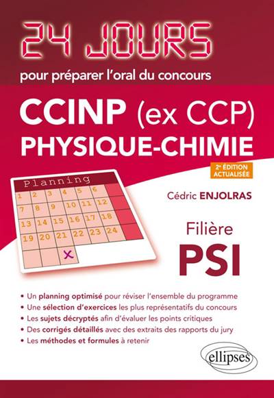 La collection « 24 jours pour préparer l’oral » vous assurera des révisions solides entre les écrits et les oraux grâce au planning de travail fourni par les auteurs expérimentés, enseignants de classes préparatoires. Ce planning est fondé sur 24 séances de travail réparties sur 4 semaines de 6 jours. Durant chaque séance, vous pourrez vous exercer sur un sujet de type concours puis vous consacrer à une analyse minutieuse de tout l’ensemble du corrigé (analyse de l’énoncé, corrigé détaillé, techniques à mémoriser, formulaire et nombreux extraits des rapports de jurys).