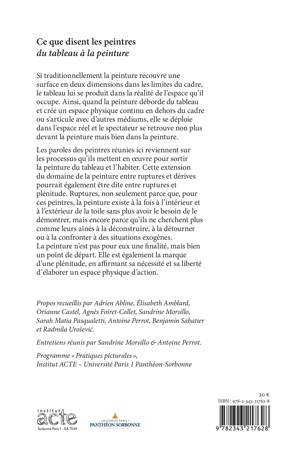 Si traditionnellement la peinture recouvre une surface en deux dimensions dans les limites du cadre, le tableau lui se produit dans la réalité de l'espace qu'il occupe. Ainsi, quand la peinture déborde du tableau et crée un espace physique continu en dehors du cadre ou s'articule avec d'autres médiums, elle se déploie dans l'espace réel et le spectateur se retrouve non plus devant la peinture mais bien dans la peinture. Les paroles des peintres réunies ici reviennent sur les processus qu'ils mettent en oeuvre pour sortir la peinture du tableau et l'habiter.