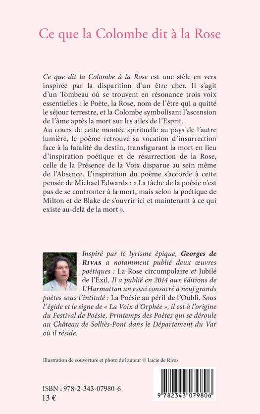 Ce que dit la colombe à la Rose est une stèle en vers inspirée par la disparition d'un être cher. Il s'agit d'un Tombeau où se trouvent en résonance trois voix essentielles : le Poète, la Rose, nom de l'être qui a quitté le séjour terrestre, et la Colombe symbolisant l'ascension de l'âme après la mort sur les ailes de l'Esprit. L'inspiration du poème s'accorde à cette pensée de Michael Edwards : « La tâche de la poésie n'est pas de se confronter à la mort, mais selon la poétique de Milton et de Blake de s'ouvrir ici et maintenant à ce qui existe au-delà de la mort. »