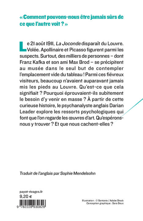 Le 21 août 1911, La Joconde disparaît du Louvre. Volée. Apollinaire et Picasso figurent parmi les suspects. Surtout, des milliers de personnes - dont Franz Kafka et son ami Max Brod - se précipitent au musée dans le seul but de contempler l'emplacement vide du tableau ! Parmi ces fiévreux visiteurs, beaucoup n'avaient auparavant jamais mis les pieds au Louvre. Qu'est-ce que cela signifiait ? Pourquoi éprouvaient-ils subitement le besoin d'y venir en masse ? À partir de cette curieuse histoire, le psychanalyste anglais Darian Leader explore les ressorts psychologiques qui font que l'on regarde les oeuvres d'art. Qu'espérons-nous y trouver ? Et que nous cachent-elles ?