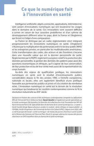 Intelligence artificielle, objets connectés, applications, télémédecine, sont autant d'innovations numériques qui ont bouleversé les usages dans le domaine de la santé. Ces innovations sont souvent difficiles à cerner en raison de leur caractère protéiforme et d'un rythme de développement différent selon les pays, dont la France et l'Angleterre qui feront ici l'objet d'une comparaison. La France se distingue par un cadre réglementaire strict intégrant progressivement les innovations numériques en santé. L'Angleterre s'illustre par la multiplication de partenariats entre le secteur public (NHS) et les entreprises privées, en particulier les multinationales américaines. Cette transformation des codes, des acteurs et des frontières s'incarne dans une nouvelle valeur qui est la donnée personnelle de santé. Réglementée par le RGPD, règlement européen relatif à la protection des données personnelles, la gestion des données des patients pose aussi des questions économiques et éthiques, qu'il s'agisse de leur conservation, de leur protection et/ou de leur vente mais aussi de la représentation du corps humain. Au-delà des enjeux de qualification juridique, les innovations numériques en santé sont le résultat d'investissements publics considérables depuis la fin des années 1990, à l'échelle européenne, nationale et locale; elles ont également bénéficié d'une politique favorable aux partenariats publics et privés et à la création de nombreux relais. L'innovation numérique en santé est le témoin de la révolution numérique qui bouleverse les sociétés contemporaines comme le fit la révolution industrielle au XIXe siècle.
