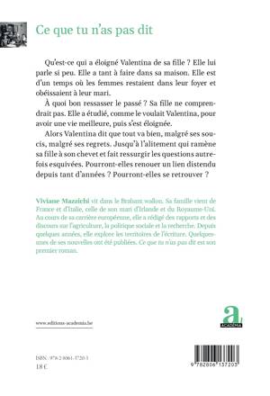Qu'est-ce qui a éloigné Valentina de sa fille ? Elle lui parle si peu. Elle a tant à faire dans sa maison. Elle est d'une autre génération, celle où les femmes obéissaient à leur mari. Pourquoi ressasser le passé ? Sa fille ne comprendrait pas. Elle a étudié, comme le voulait Valentina. Pour qu'elle ait une autre vie. Et elle est partie. Alors Valentina dit que tout va bien. Jusqu'à l'alitement qui ramènera sa fille à son chevet et fera ressurgir les questions qu'elle avait esquivées.
