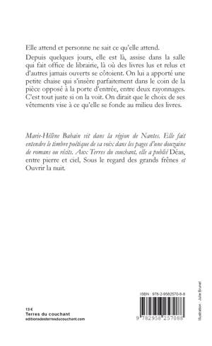 Elle attend et personne ne sait ce qu’elle attend. Depuis quelques jours, elle est là, assise dans la salle qui fait office de librairie, là où des livres lus et relus et d’autres jamais ouverts se côtoient. On lui a apporté une petite chaise qui s’insère parfaitement dans le coin de la pièce opposé à la porte d’entrée, entre deux rayonnages. C’est tout juste si on la voit. On dirait que le choix de ses vêtements vise à ce qu’elle se fonde au milieu des livres.
