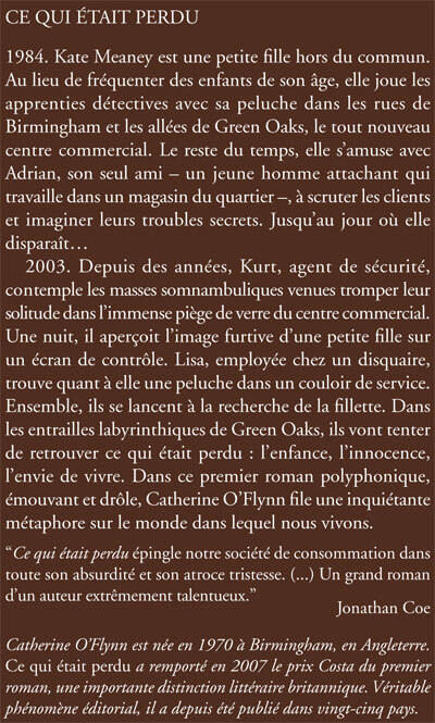 1984. Kate Meaney est une petite fille hors du commun. Au lieu de fréquenter des enfants de son âge, elle joue les apprenties détectives avec sa peluche dans les rues de Birmingham et les allées de Green Oaks, le tout nouveau centre commercial. Le reste du temps, elle s'amuse avec Adrian, son seul ami - un jeune homme attachant qui travaille dans un magasin du quartier -, à scruter les clients et imaginer leurs troubles secrets. Jusqu'au jour où elle disparaît... 2003. Depuis des années, Kurt, agent de sécurité, contemple les masses somnambuliques venues tromper leur solitude dans l'immense piège de verre du centre commercial. Une nuit, il aperçoit l'image furtive d'une petite fille sur un écran de contrôle. Lisa, employée chez un disquaire, trouve quant à elle une peluche dans un couloir de service. Ensemble, ils se lancent à la recherche de la fi llette. Dans les entrailles labyrinthiques de Green Oaks, ils vont tenter de retrouver ce qui était perdu : l'enfance, l'innocence, l'envie de vivre. Dans ce premier roman polyphonique, émouvant et drôle, Catherine O'Flynn file une inquiétante métaphore sur le monde dans lequel nous vivons.