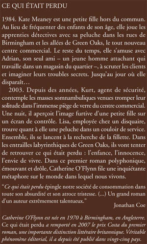 «Catherine O'Flynn est née en 1970 à Birmingham, en Angleterre. Ce qui était perdu a remporté en 2007 le prix Costa du premier roman, une importante distinction littéraire britannique. Véritable phénomène éditorial, il a depuis été publié dans vingt-cinq pays.»