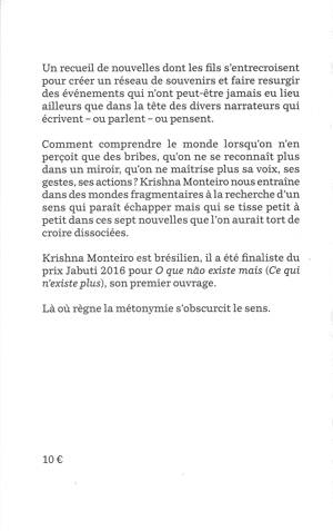 Un recueil de nouvelles dont les fils s’entrecroisent pour créer un réseau de souvenirs et faire resurgir des événements qui n’ont peut-être jamais eu lieu ailleurs que dans la tête des divers narrateurs qui écrivent – ou parlent – ou pensent. Comment comprendre le monde lorsqu’on n’en perçoit que des bribes, qu’on ne se reconnaît plus dans un miroir, qu’on ne maîtrise plus sa voix, ses gestes, ses actions ? Krishna Monteiro nous entraîne dans des mondes fragmentaires à la recherche d’un sens qui paraît échapper mais qui se tisse petit à petit dans ces sept nouvelles que l’on aurait tort de croire dissociées. Krishna Monteiro est brésilien, il a été finaliste du prix Jabuti 2016 pour O que não existe mais (Ce qui n’existe plus), son premier ouvrage.