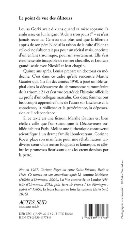 Si ce texte est une fiction, Marthe Gautier est bien réelle : celle que l'on surnomme la Découvreuse oubliée habite à Paris. Mêlant une authentique controverse scientifique à un drame familial bouleversant, Corinne Royer place son manifeste pour une réhabilitation tardive au coeur d'un roman fougueux et fantasque, et célèbre les promesses fleurissant dans les creux dessinés par la perte.