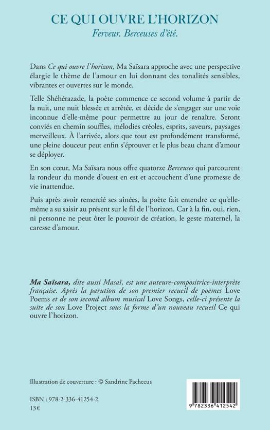 Dans Ce qui ouvre l'horizon, Ma Saïsara approche avec une perspective élargie le thème de l'amour en lui donnant des tonalités sensibles, vibrantes et ouvertes sur le monde. Telle Shéhérazade, la poète commence ce second volume à partir de la nuit, une nuit blessée et arrêtée, et décide de s'engager sur une voie inconnue d'elle-même pour permettre au jour de renaître. Seront conviés en chemin souffles, mélodies créoles, esprits, saveurs, paysages merveilleux. À l'arrivée, alors que tout est profondément transformé, une pleine douceur peut enfin s'éprouver et le plus beau chant d'amour se déployer. En son coeur, Ma Saïsara nous offre quatorze Berceuses qui parcourent la rondeur du monde d'ouest en est et accouchent d'une promesse de vie inattendue. Puis après avoir remercié ses aînées, la poète fait entendre ce qu'elle-même a su saisir au présent sur le fil de l'horizon. Car à la fin, oui, rien, ni personne ne peut ôter le pouvoir de création, le geste maternel, la caresse d'amour.