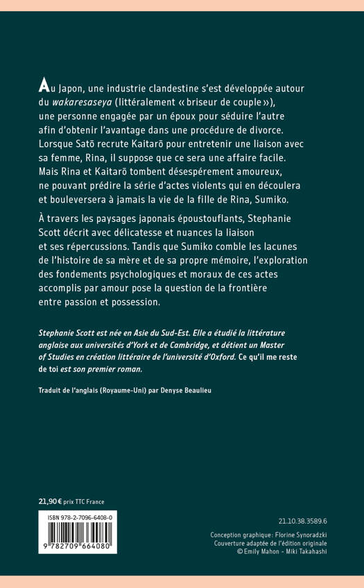 À travers les paysages japonais époustouflants, Stephanie Scott décrit avec délicatesse et nuances la liaison et ses répercussions. Tandis que Sumiko comble les lacunes de l'histoire de sa mère et de sa propre mémoire, l'exploration des fondements psychologiques et moraux de ces actes accomplis par amour pose la question de la frontière entre passion et possession.