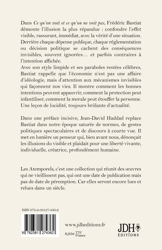 Dans Ce qu'on voit et ce qu'on ne voit pas, Frédéric Bastiat démonte l'illusion la plus répandue : confondre l'effet visible, rassurant, immédiat, avec la vérité d'une situation. Derrière chaque dépense publique, chaque réglementation ou décision politique se cachent des conséquences invisibles, souvent ignorées... et parfois contraires à l'intention affichée. Avec son style limpide et ses paraboles restées célèbres, Bastiat rappelle que l'économie n'est pas une affaire d'idéologie, mais d'attention aux mécanismes invisibles qui façonnent nos vies. Il montre comment les bonnes intentions peuvent appauvrir, comment la protection peut infantiliser, comment la morale peut étouffer la personne. Une leçon de lucidité, toujours brûlante d'actualité. Dans une préface incisive, Jean-David Haddad replace Bastiat dans notre époque saturée de normes, de gestes politiques spectaculaires et de discours à courte vue. Il met en lumière un penseur qui, bien avant nous, dénonçait les illusions du visible et plaidait pour une liberté vivante, individuelle, créatrice, profondément humaine.