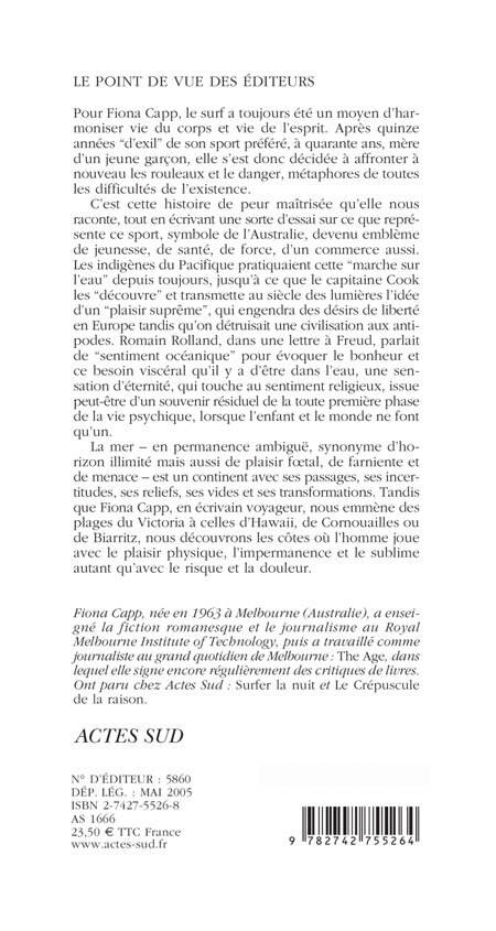 Pour Fiona Capp, le surf a toujours été un moyen d'harmoniser vie du corps et vie de l'esprit. Après quinze années "d'exil" de son sport préféré, à quarante ans, mère d'un jeune garçon, elle s'est donc décidée à affronter à nouveau les rouleaux et le danger, métaphores de toutes les difficultés de l'existence. C'est cette histoire de peur maîtrisée qu'elle nous raconte, tout en écrivant une sorte d'essai sur ce que représente ce sport, symbole de l'Australie, devenu emblème de jeunesse, de santé, de force, d'un commerce aussi. Les indigènes du Pacifique pratiquaient cette "marche sur l'eau" depuis toujours, jusqu'à ce que le capitaine Cook les "découvre" et transmette au siècle des lumières l'idée d'un "plaisir suprême", qui engendra des désirs de liberté en Europe tandis qu'on détruisait une civilisation aux antipodes. Romain Rolland, dans une lettre à Freud, parlait de "sentiment océanique" pour évoquer le bonheur et ce besoin viscéral qu'il y a d'être dans l'eau, une sensation d'éternité, qui touche au sentiment religieux, issue peut-être d'un souvenir résiduel de la toute première phase de la vie psychique, lorsque l'enfant et le monde ne font qu'un. La mer - en permanence ambiguë, synonyme d'horizon illimité mais aussi de plaisir foetal, de farniente et de menace — est un continent avec ses passages, ses incertitudes, ses reliefs, ses vides et ses transformations. Tandis que Fiona Capp, en écrivain voyageur, nous emmène des plages du Victoria à celles d'Hawaii, de Cornouailles ou de Biarritz, nous découvrons les côtes où l'homme joue avec le plaisir physique, l'impermanence et le sublime autant qu'avec le risque et la douleur.