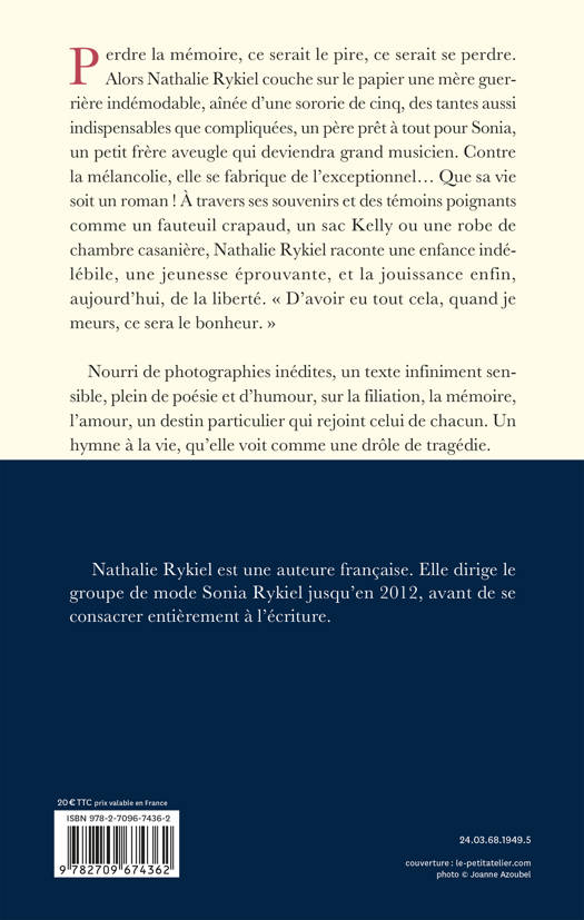 Perdre la mémoire, ce serait le pire, ce serait se perdre. Alors Nathalie Rykiel couche sur le papier une mère guerrière indémodable, aînée d’une sororie de cinq, des tantes aussi indispensables que compliquées, un père prêt à tout pour Sonia, un petit frère aveugle qui deviendra grand musicien. Contre la mélancolie, elle se fabrique de l’exceptionnel… Que sa vie soit un roman ! À travers ses souvenirs et des témoins poignants comme un fauteuil crapaud, un sac Kelly ou une robe de chambre casanière, Nathalie Rykiel raconte une enfance indélébile, une jeunesse éprouvante, et la jouissance enfin, aujourd’hui, de la liberté. « D’avoir eu tout cela, quand je meurs, ce sera le bonheur. » Nourri de photographies inédites, un texte infiniment sensible, plein de poésie et d’humour, sur la filiation, la mémoire, l’amour, un destin particulier qui rejoint celui de chacun. Un hymne à la vie, qu’elle voit comme une drôle de tragédie.